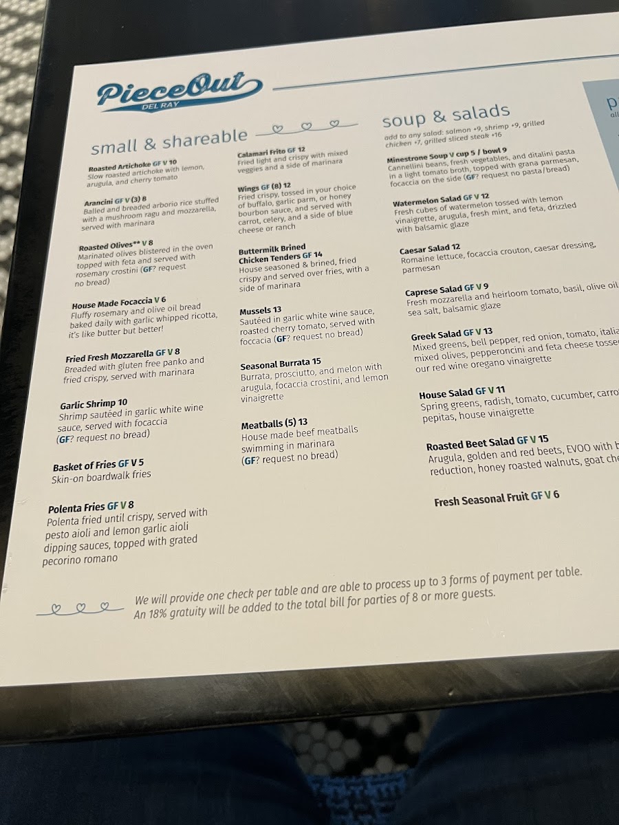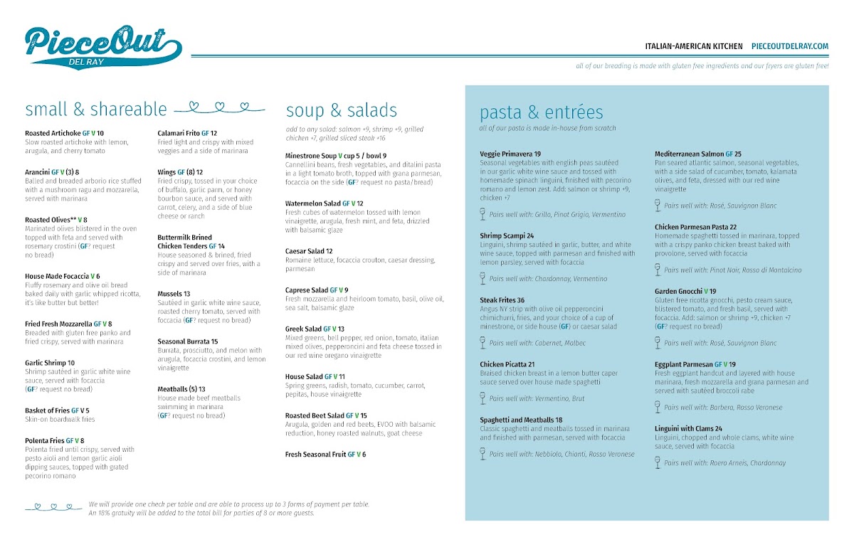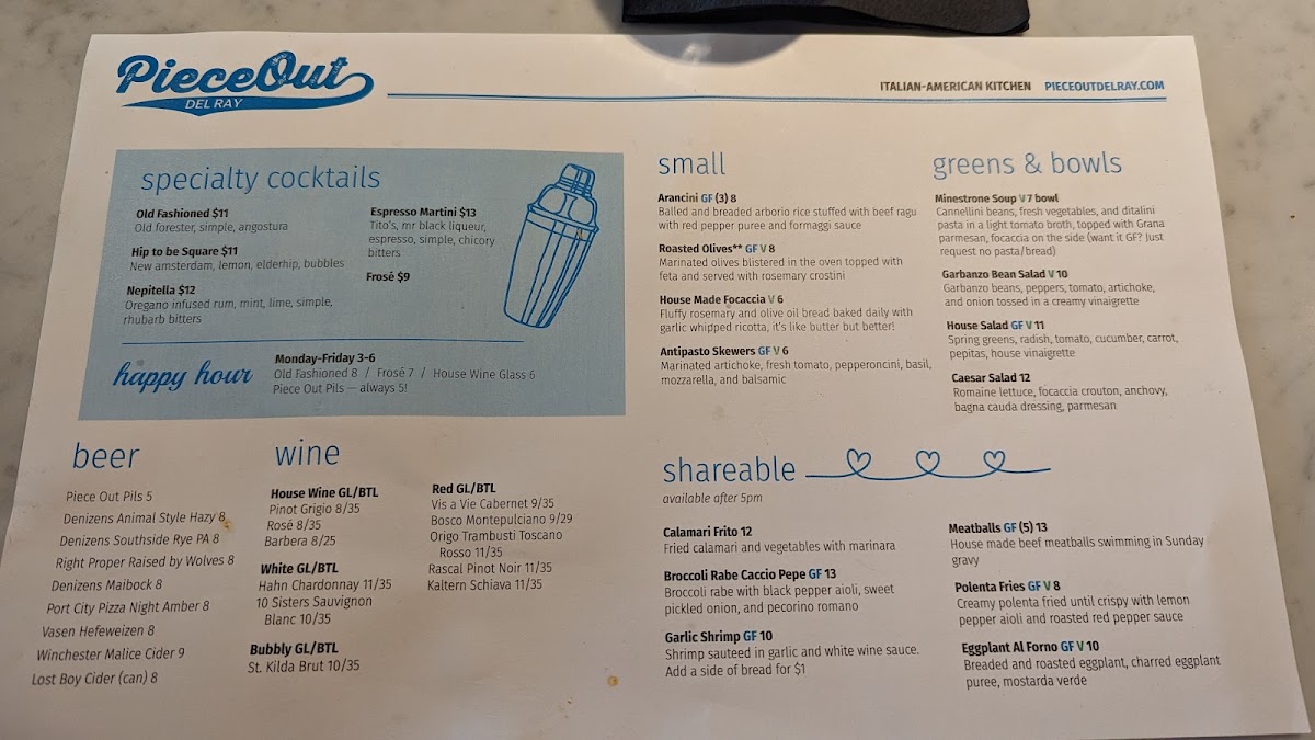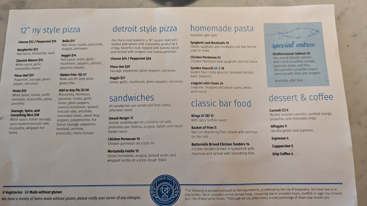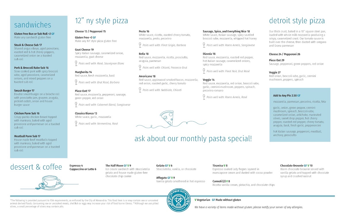 The menu at Piece Out Del Ray offers a relaxed, approachable selection that reflects its casual and inviting atmosphere. Centered around Italian and pizza favorites, the dishes range from shareable small plates like roasted artichoke and arancini to hearty, satisfying pizzas including Detroit-style pepperoni and white pizza. Alongside these, thoughtfully crafted salads and soups provide lighter options that pair well with the laid-back setting.