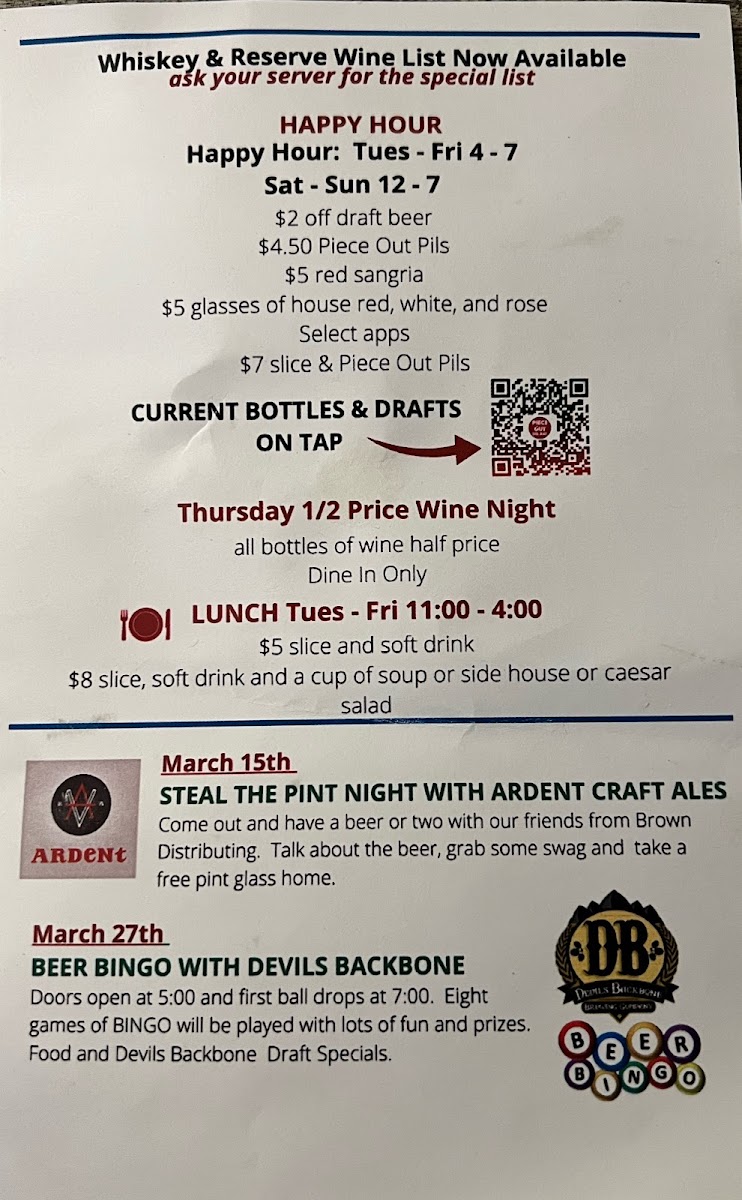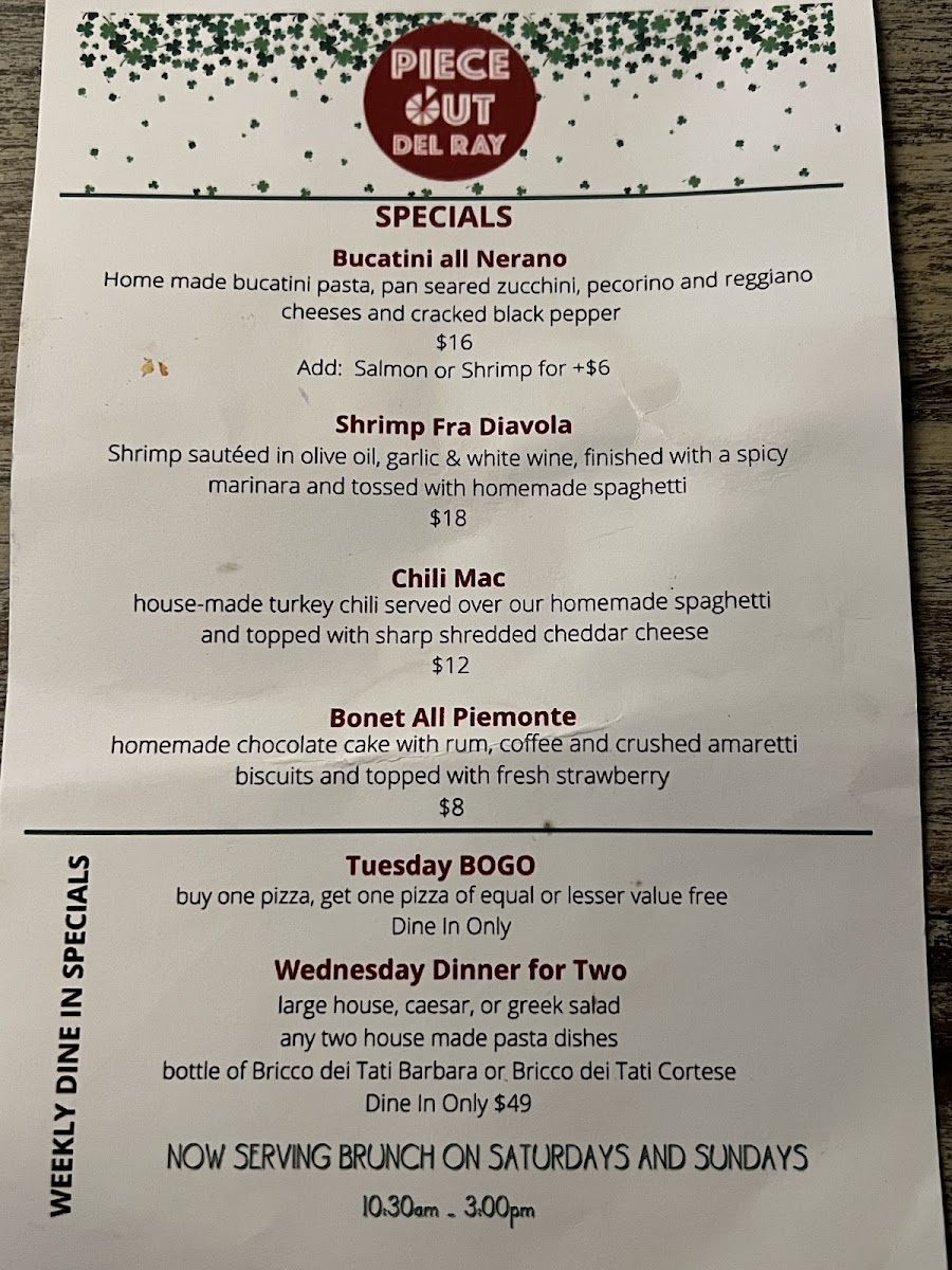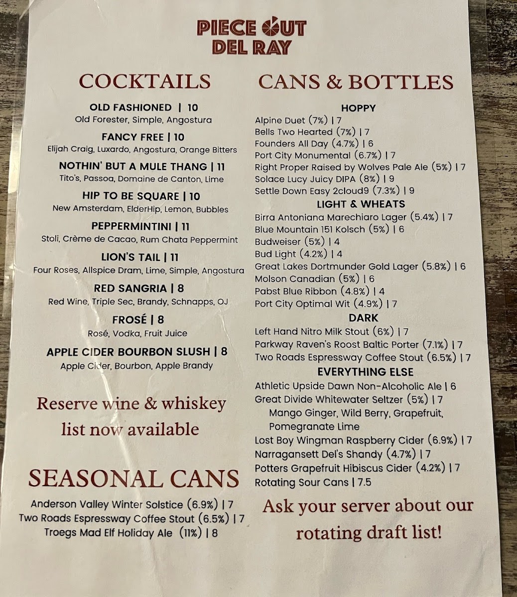 Many guests find themselves enjoying these flavors throughout the day—whether grabbing a slice by the afternoon, meeting friends for a casual dinner, or winding down with a dessert like classic tiramisu or a creamy affogato. Beverage choices such as house-brewed Piece Out Pilsner, refreshing frozé, and warm espresso drinks complement the food and create a welcoming space for everyday moments.